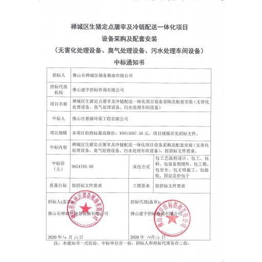 禅城区生猪定点屠宰冷链配送一体化项目设备及配套安装(无害化处理设备、臭气处理设备、污水处理车间设备)——中标通知书