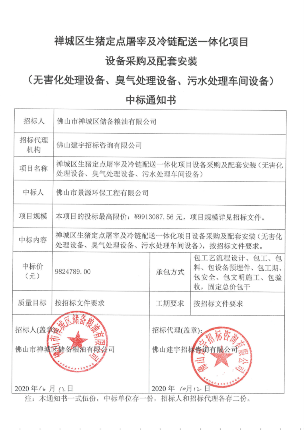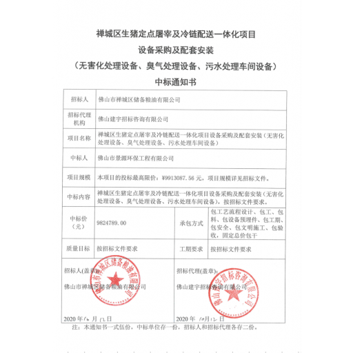 澄海区生猪定点屠宰场废气处理项目中标通知书