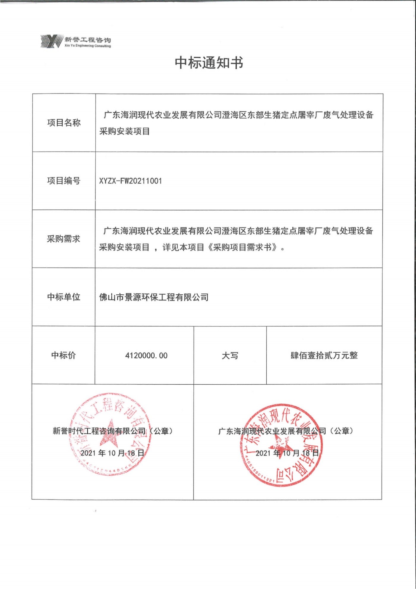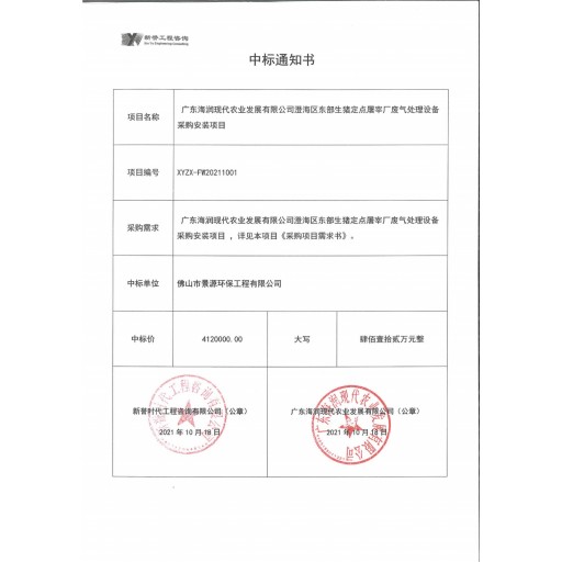 澄海区生猪定点屠宰场废气处理项目中标通知书